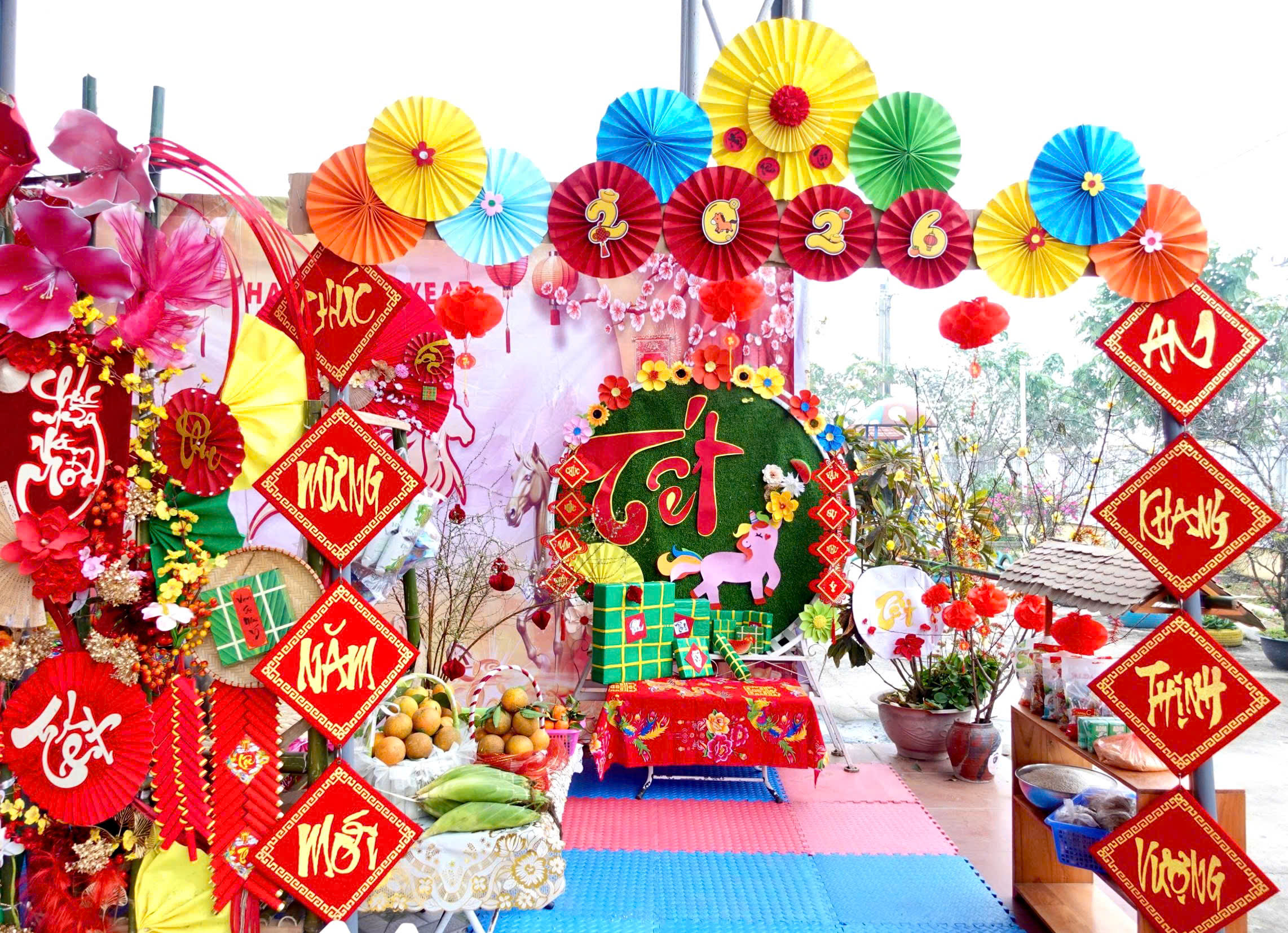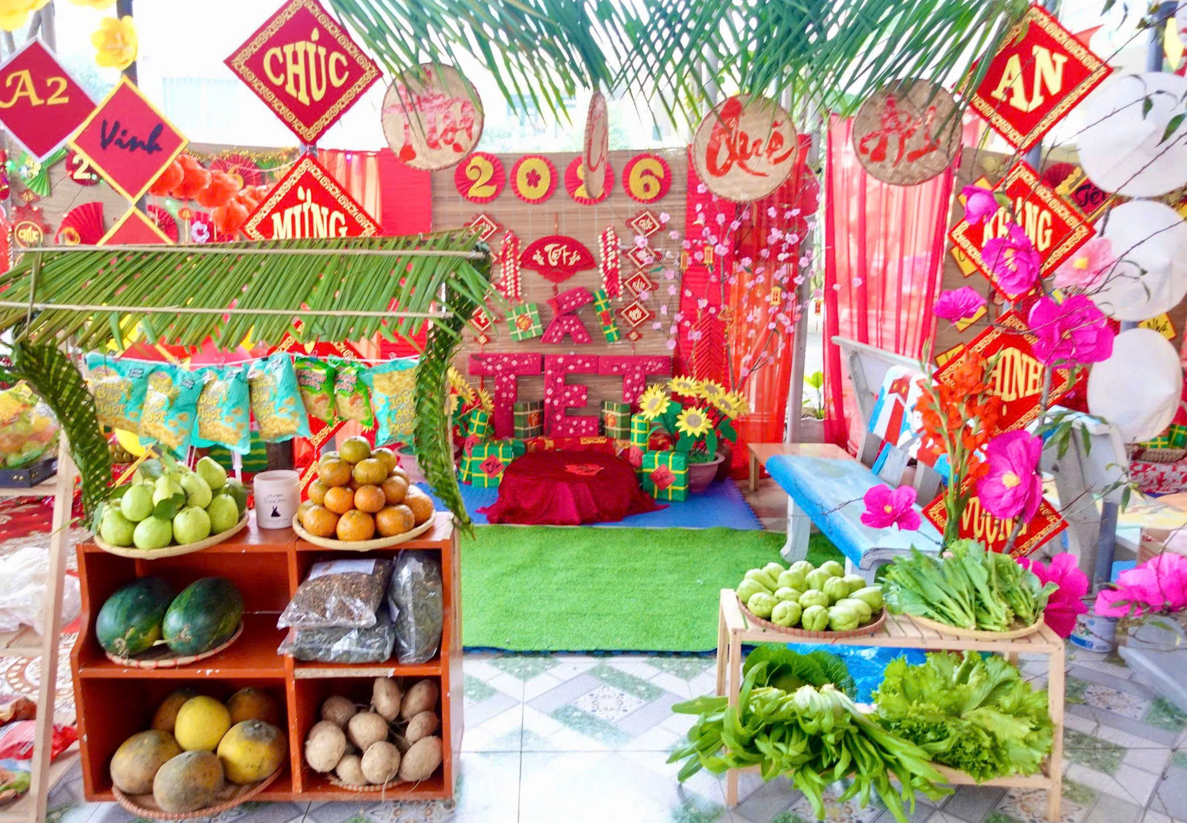 Bên cạnh đó, khu vực các gian hàng Hội chợ xuân được trang trí đẹp mắt, sáng tạo, mang đậm không khí Tết cổ truyền đã thu hút sự quan tâm của đông đảo phụ huynh và học sinh. Tại đây, các em được tham gia trải nghiệm các hoạt động vui chơi, khám phá các sản phẩm truyền thống, đồ thủ công, ẩm thực ngày Tết, qua đó rèn luyện kỹ năng giao tiếp, mạnh dạn hơn trong sinh hoạt tập thể và hình thành ý thức trân trọng giá trị lao động.