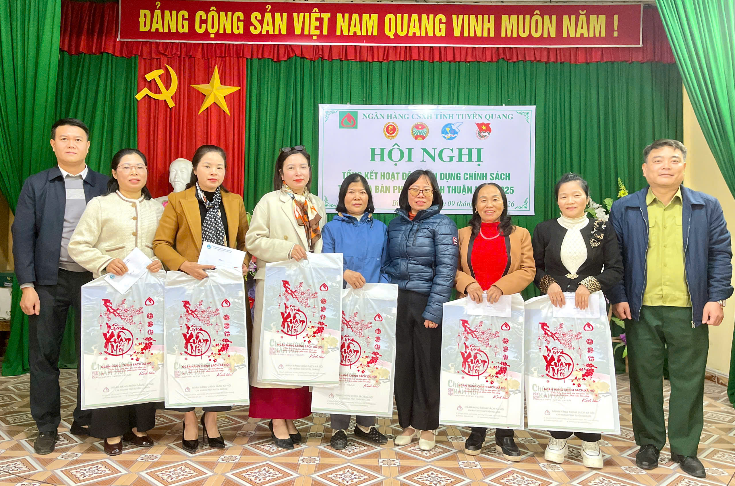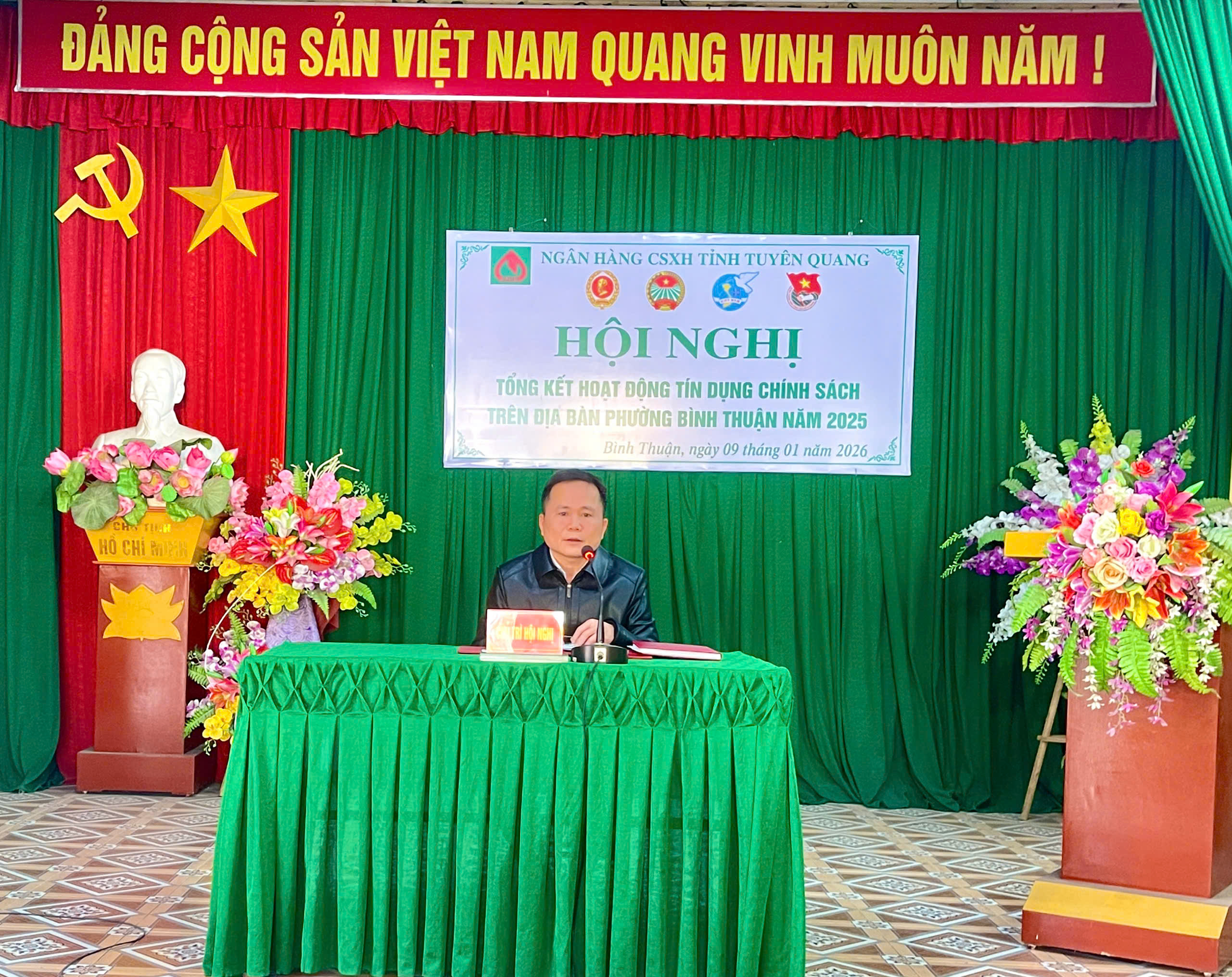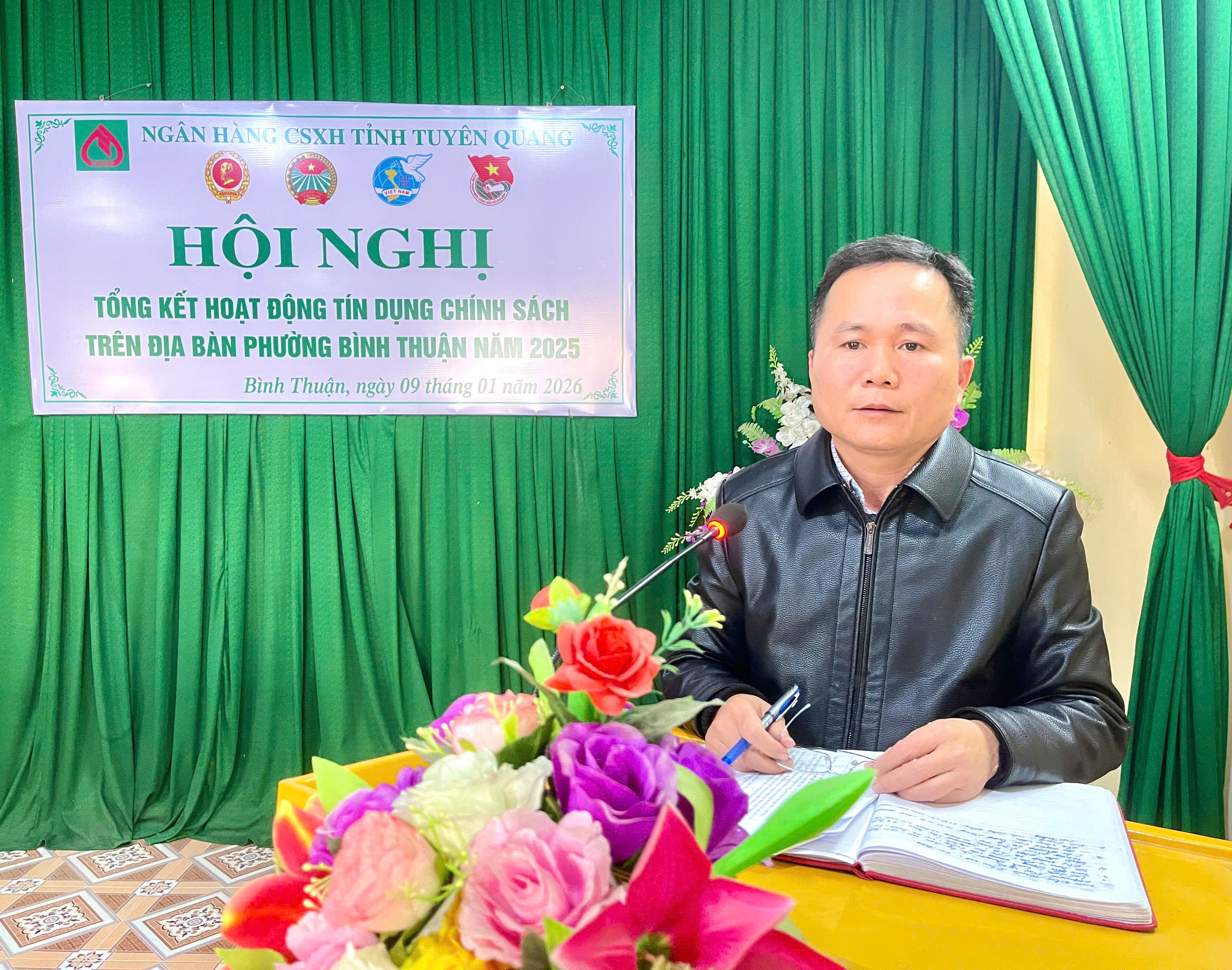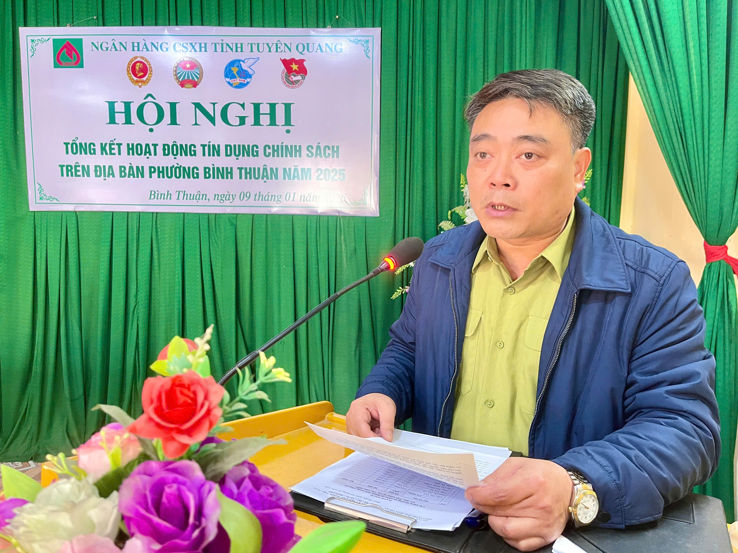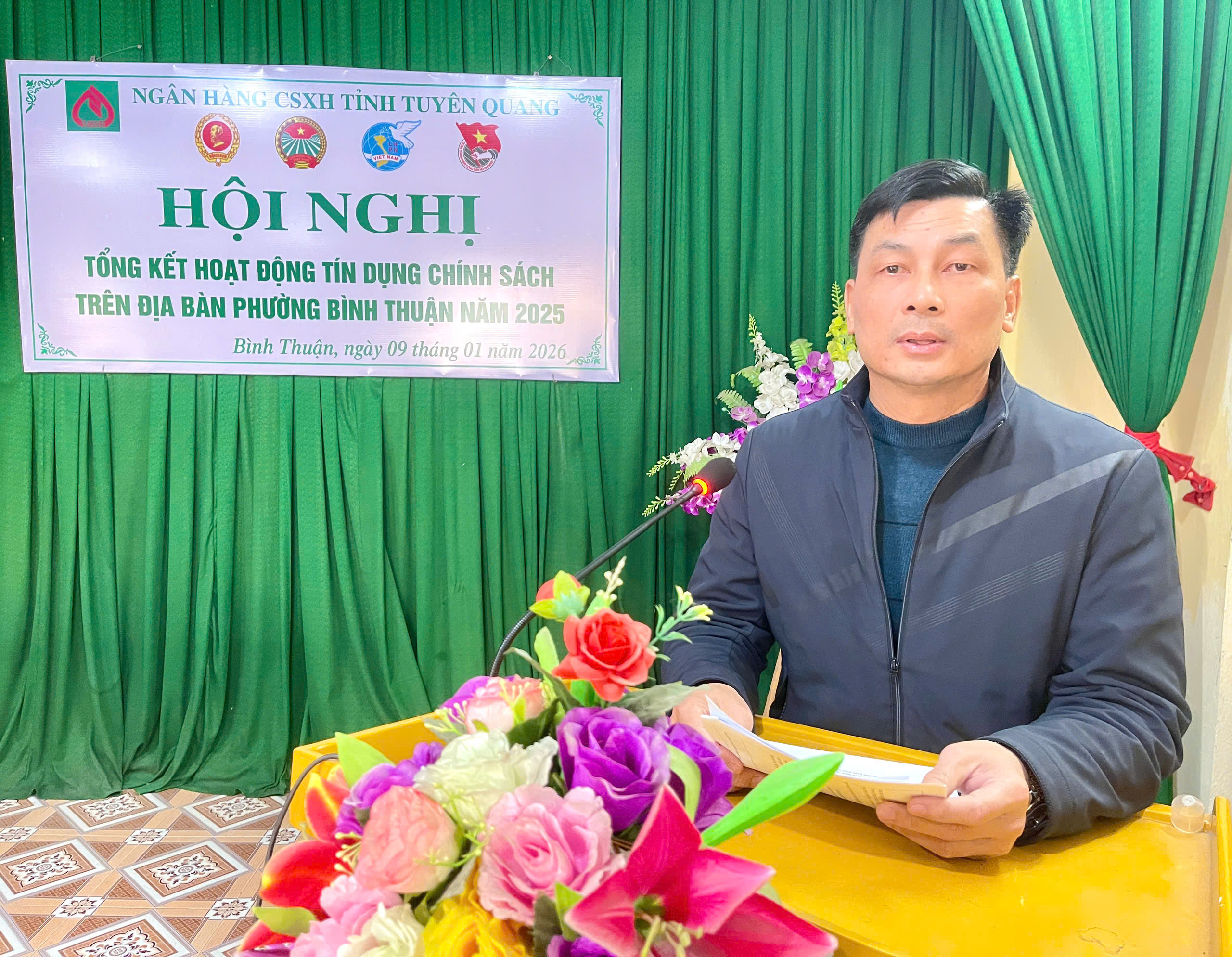 Dự hội nghị có đồng chí Vũ Thế Anh, Phó Giám đốc Ngân hàng Chính sách xã hội tỉnh Tuyên Quang; đồng chí Phan Văn Thực, Ủy viên Ban Chấp hành Đảng bộ phường, Phó Chủ tịch UBND phường Bình Thuận; cùng đại diện lãnh đạo các phòng, ban chuyên môn UBND phường, Công an phường; đại diện các tổ chức chính trị – xã hội nhận ủy thác, cán bộ Ngân hàng Chính sách xã hội phụ trách địa bàn và các Tổ trưởng Tổ tiết kiệm và vay vốn trên địa bàn phường.