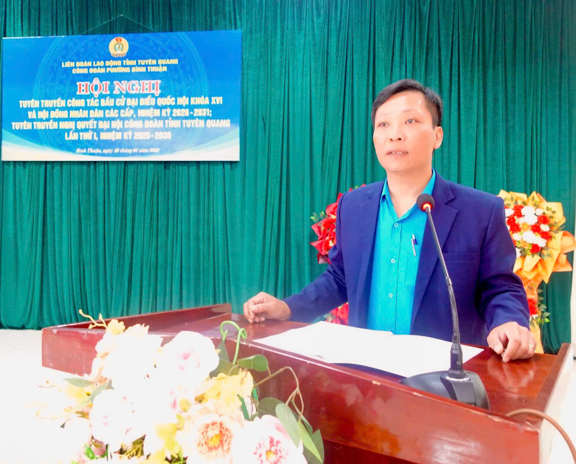 Đồng chí Hà Văn Vỹ, Phó Chủ tịch Liên đoàn Lao động tỉnh Tuyên Quang tuyên truyền những nội dung cơ bản tại hội nghị