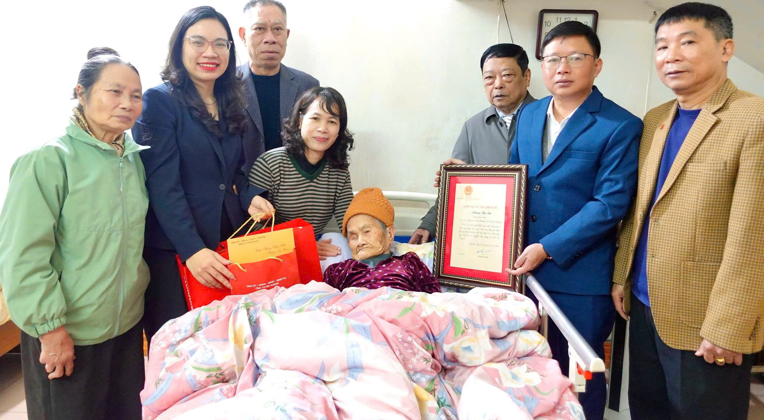 Đồng chí Nguyễn Hồng Quân, Phó Bí thư Đảng ủy, Chủ tịch UBND phường cùng Đoàn đã trực tiếp đến thăm, tặng quà, chúc tết và chúc thượng thượng thọ cụ Phạm Thị Dụ 100 tuổi.