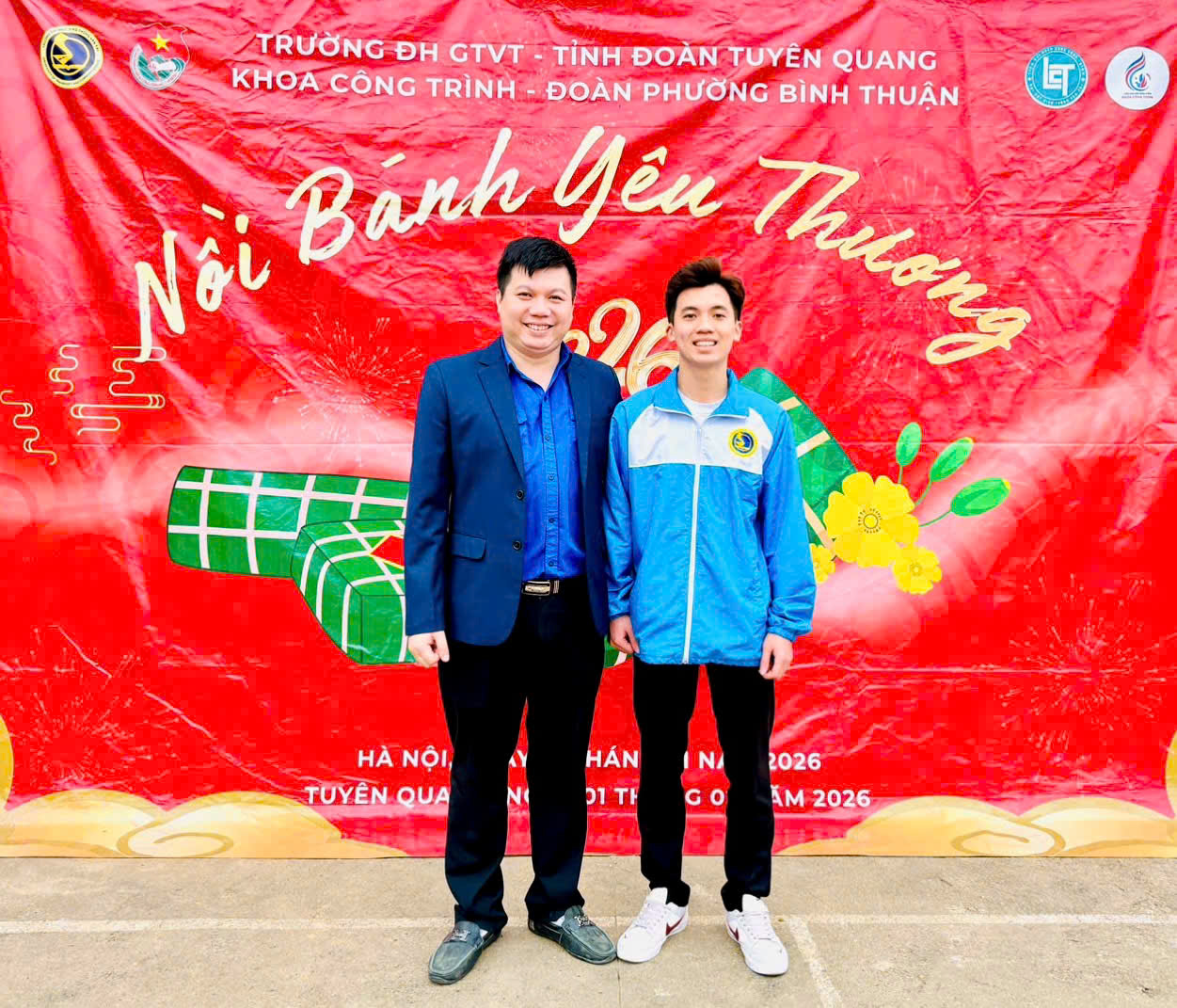 Bí thư Đoàn phường Bình Thuận chụp ảnh lưu niệm cùng Nguyễn Thành Trung – sinh viên kết nối chương trình “Nồi bánh yêu thương”