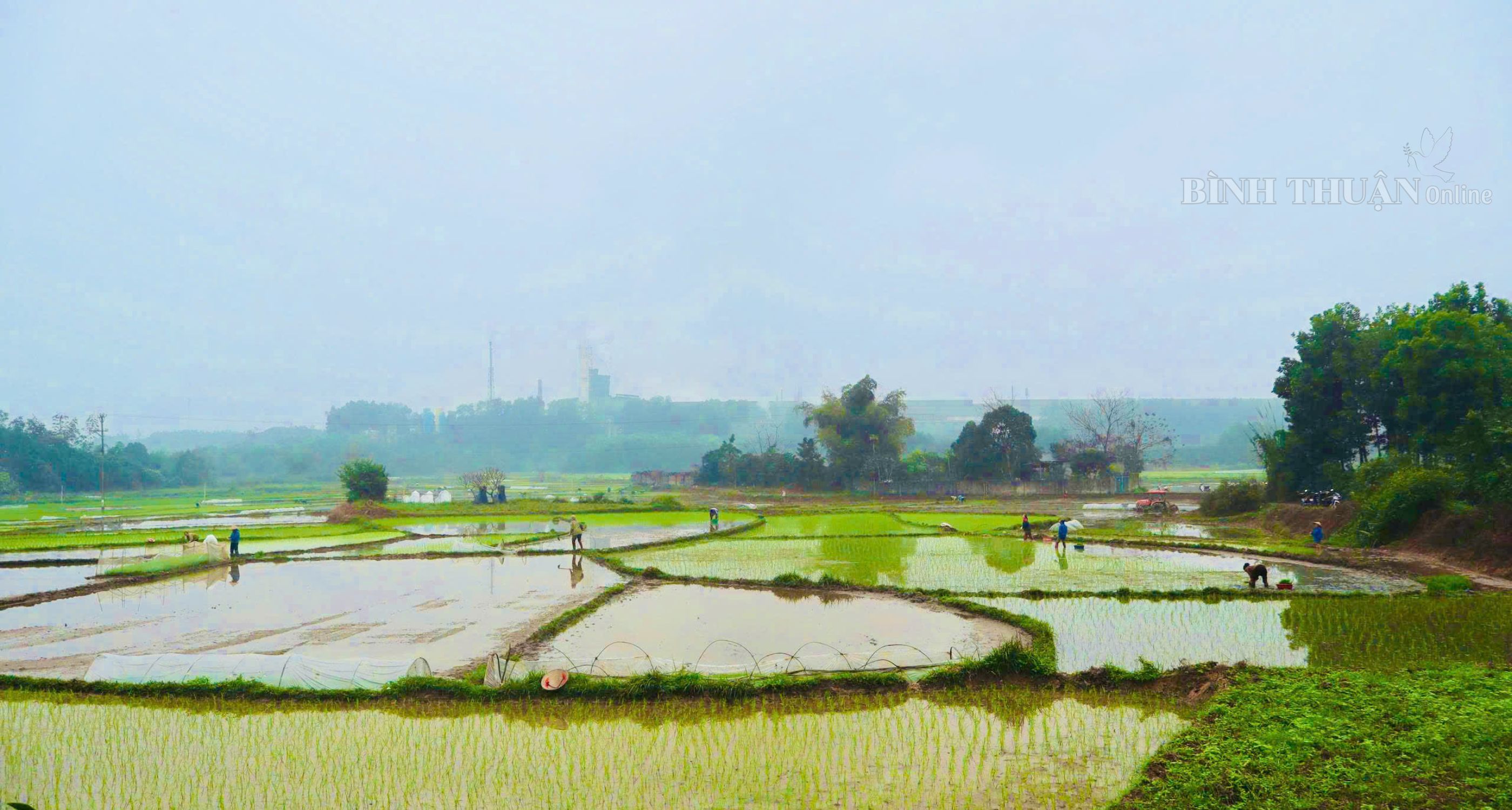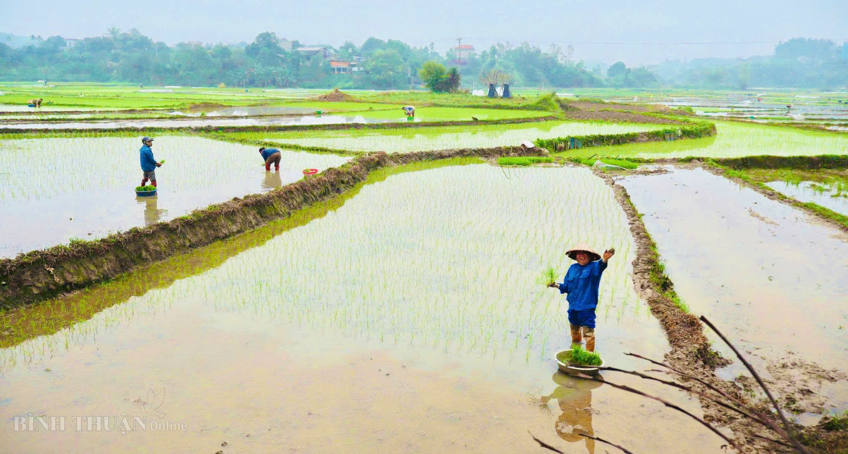 Nông dân tổ dân phố Hòa Mục, phường Bình Thuận xuống đồng cấy lúa vụ xuân.