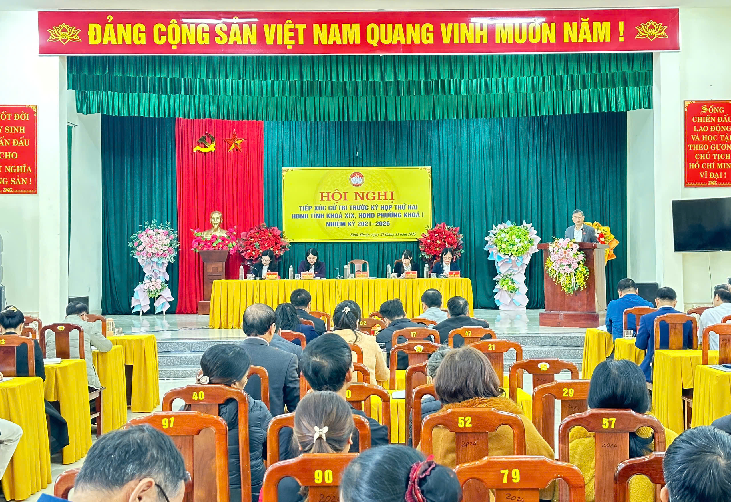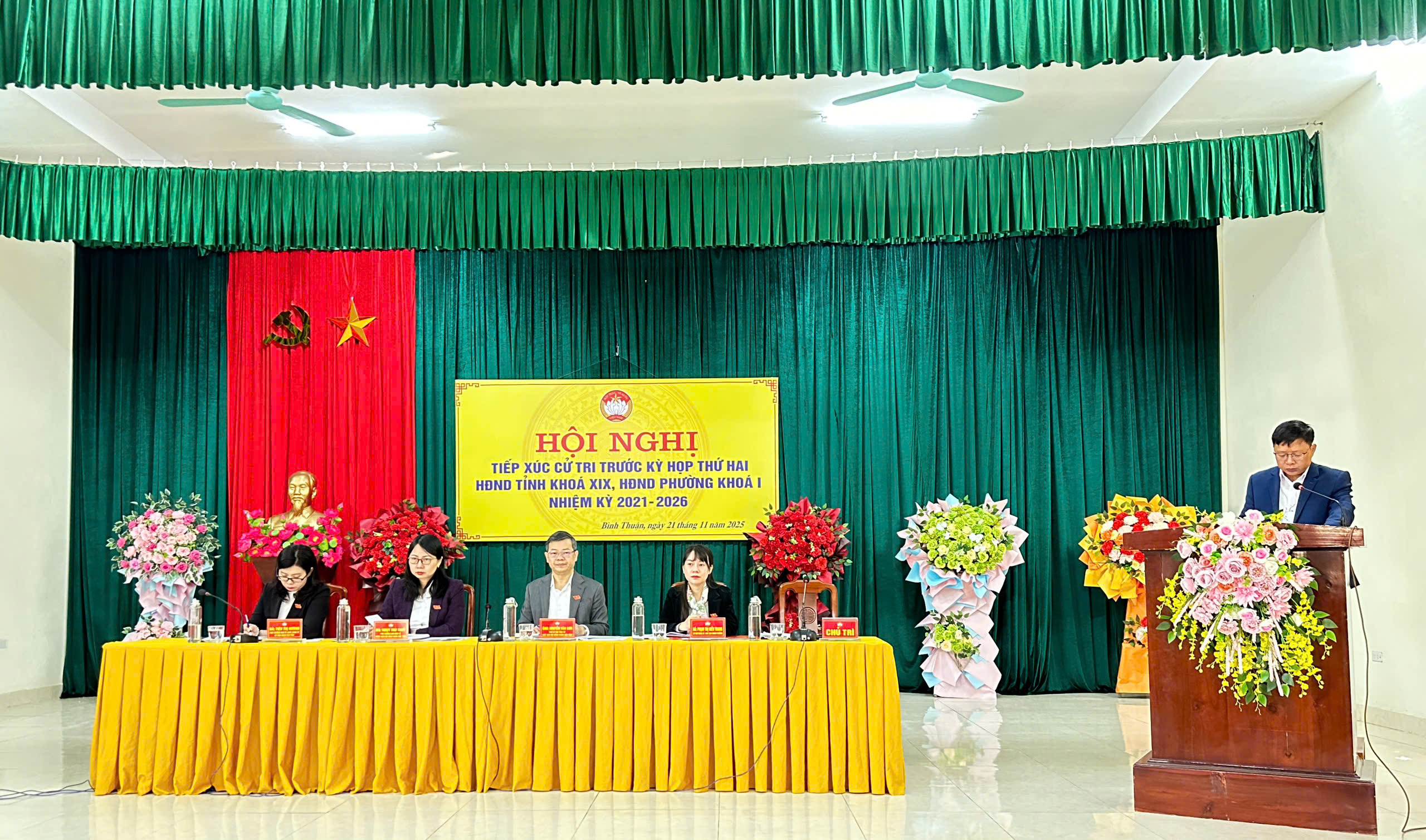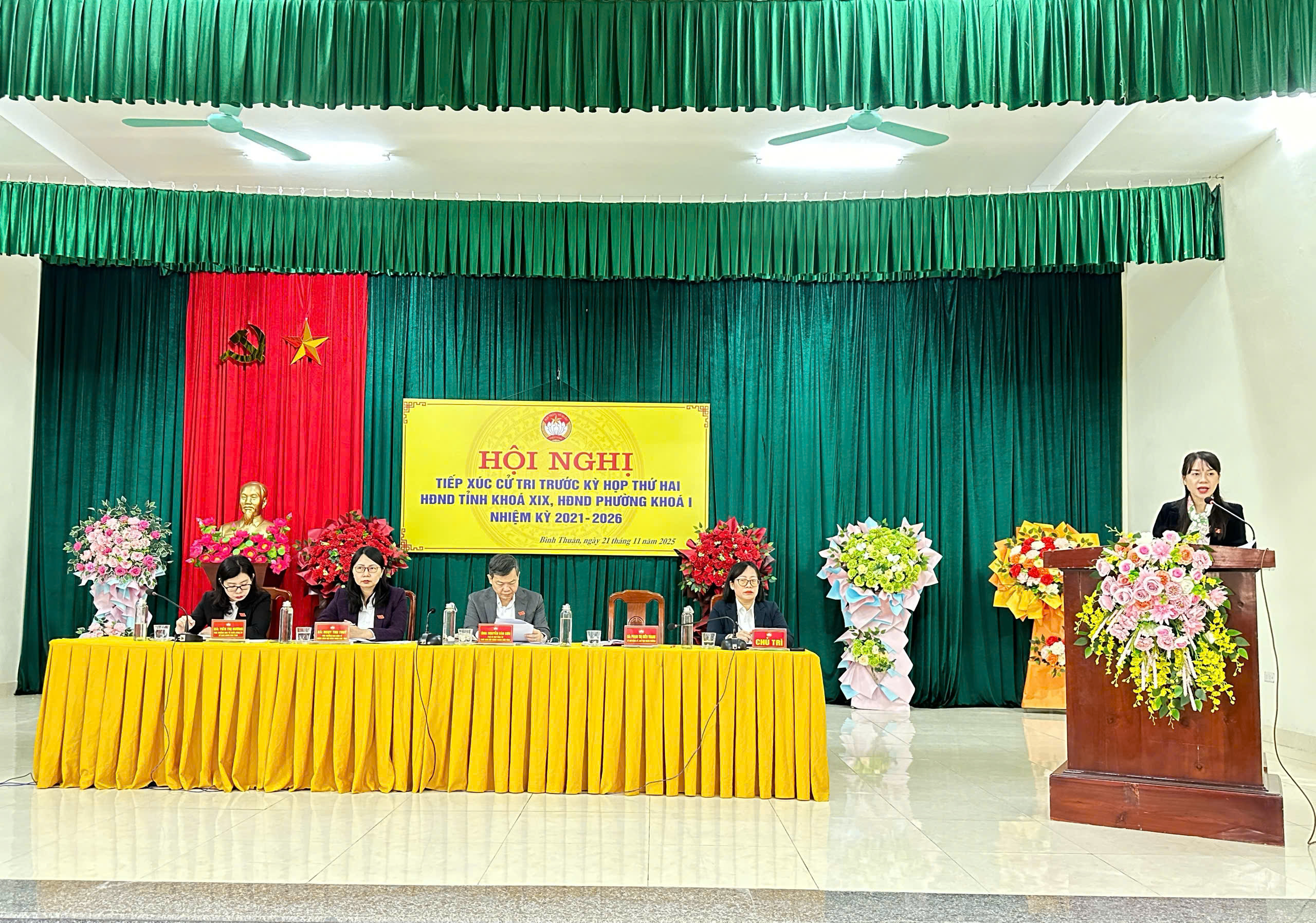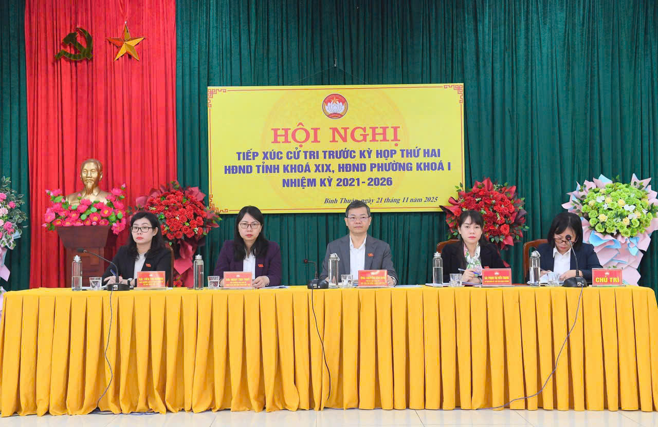 Các đại biểu HĐND tỉnh, HĐND phường chủ trì hội nghị tiếp xúc cử tri phường Bình Thuận.