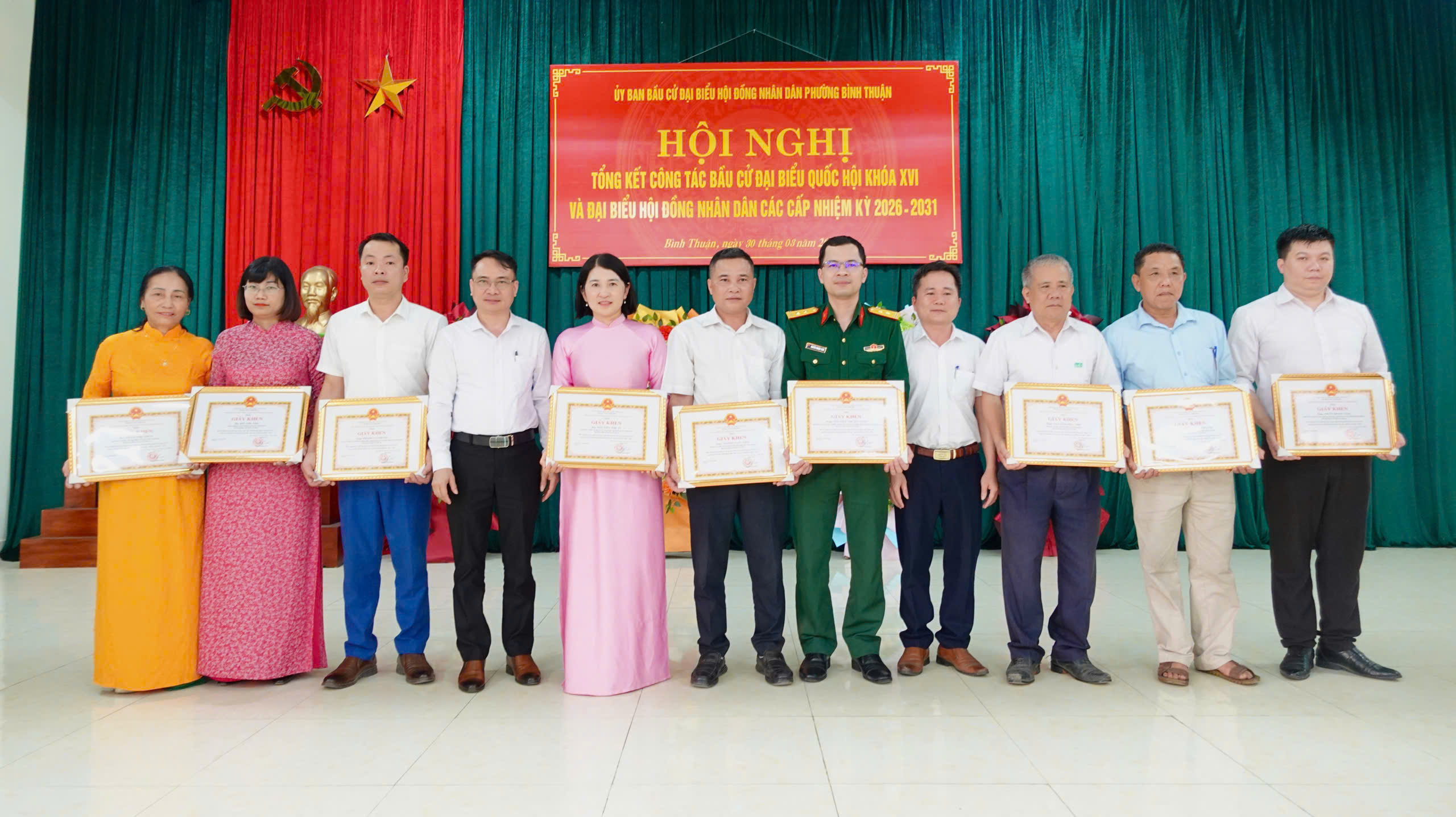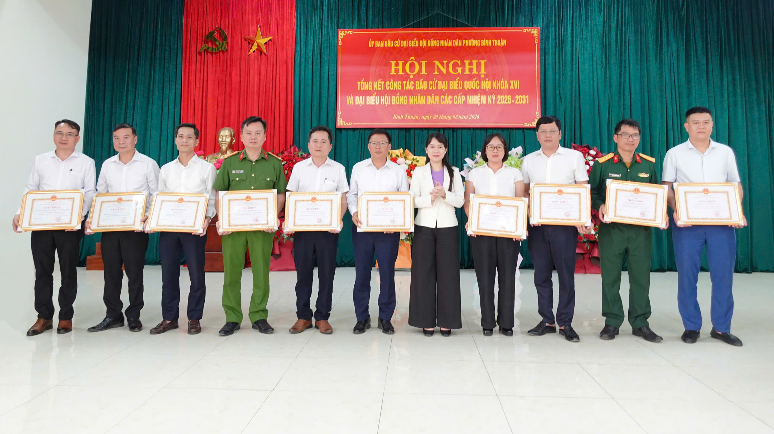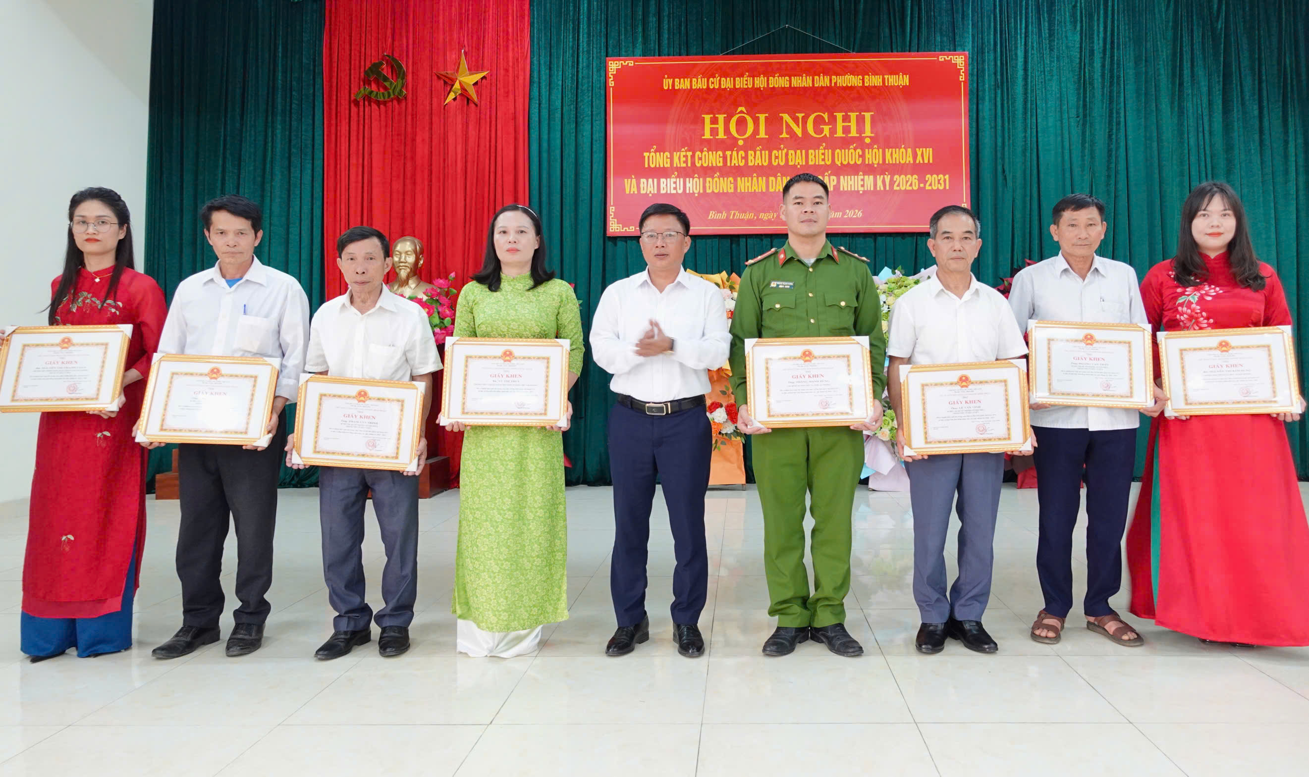 Nhân dịp này, UBND phường đã tặng giấy khen cho 12 tập thể và 38 cá nhân có thành tích xuất sắc trong phong trào thi đua thực hiện tốt công tác bầu cử đại biểu Quốc hội khóa XVI và đại biểu HĐND các cấp nhiệm kỳ 2026 - 2031.