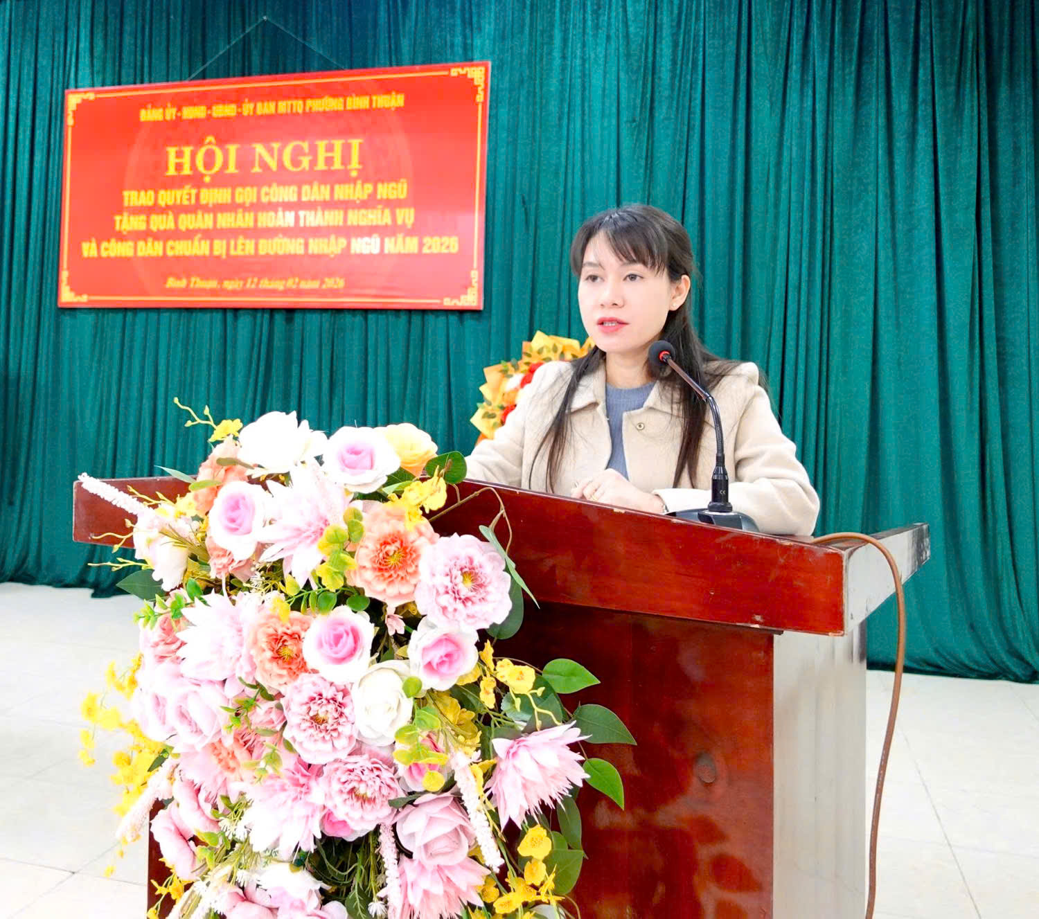 Phát biểu tại hội nghị, đồng chí Phạm Thị Kiều Trang, Bí thư Đảng ủy, Chủ tịch HĐND phường nhấn mạnh ý nghĩa của buổi gặp mặt, tặng quà quân nhân hoàn thành nghĩa vụ và công dân chuẩn bị nhập ngũ năm 2026; đồng thời khẳng định công tác tuyển chọn, gọi công dân nhập ngũ năm nay được triển khai nghiêm túc, chặt chẽ, bảo đảm chất lượng, hoàn thành 100% chỉ tiêu được giao nhờ sự vào cuộc đồng bộ của cả hệ thống chính trị và sự đồng thuận của nhân dân. Phát huy truyền thống cách mạng của quê hương, phường tin tưởng các thanh niên lên đường nhập ngũ sẽ tiếp tục rèn luyện, đoàn kết, khắc phục khó khăn, hoàn thành xuất sắc nhiệm vụ, xứng đáng với truyền thống anh hùng của địa phương; đồng thời đề nghị các quân nhân xuất ngũ giữ vững phẩm chất “Bộ đội Cụ Hồ”, tích cực tham gia xây dựng quê hương, góp phần củng cố quốc phòng – an ninh.